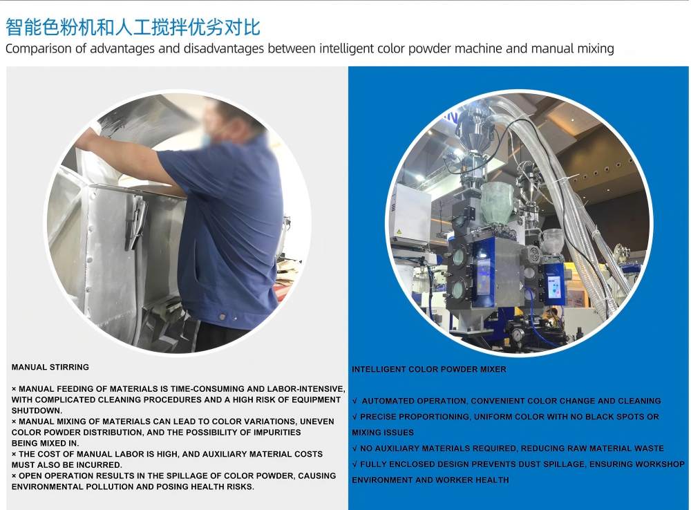 100 кг/ч„Интелигентно мешање на боја во прав“ може беспрекорно да се интегрира со централизирани системи за хранење, централни системи за пренос и системи за автоматско ракување со материјали. Пластичниот миксер за бои е опремен со сензори за мерење со висока прецизност, што обезбедува униформност на процесот на мешање и конзистентност на бојата и поддржува автоматско пропорција на повеќекомпонентните прашоци и адитиви.
